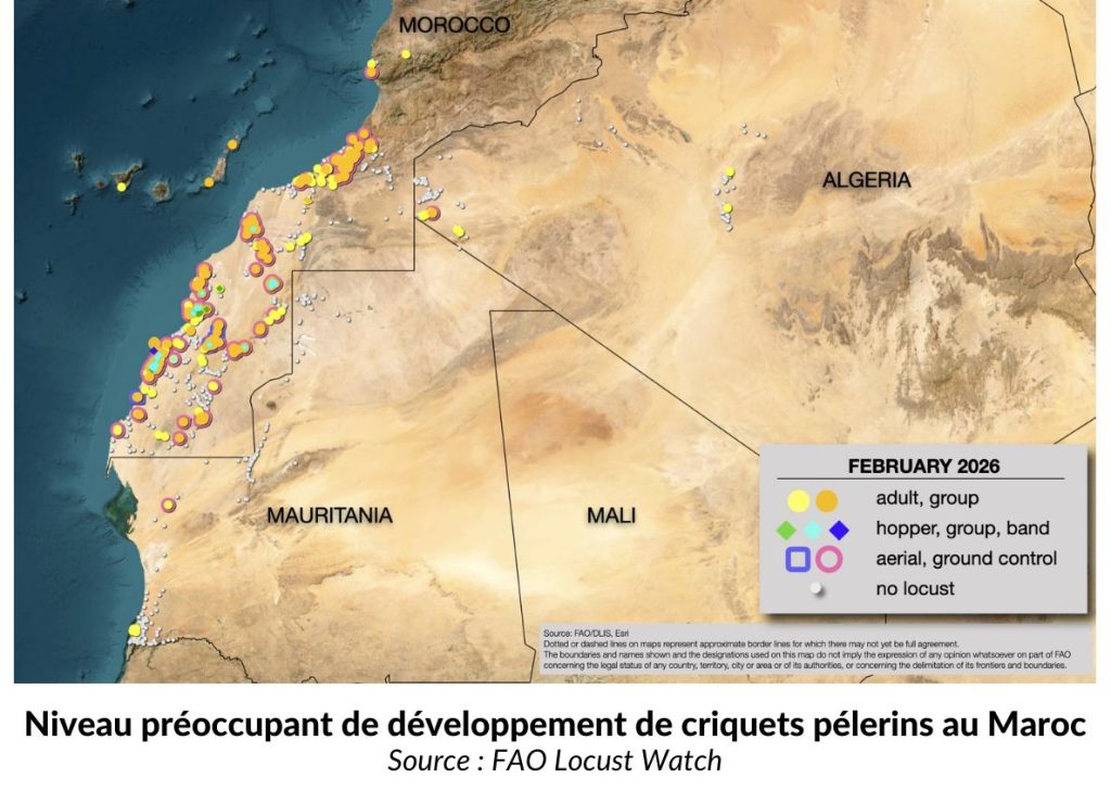 خطر غزوات الجراد الصحراوي لم يكن أبدًا مرتفعًا إلى هذا الحد في المغرب منذ عقود. الجراد الصحراوي هو أخطر الآفات المهاجرة في العالم. فرد واحد قادر على استهلاك وزنه من النبات يوميًا، ويمكنه الانتقال في أسراب تضم ملايين الأفراد.