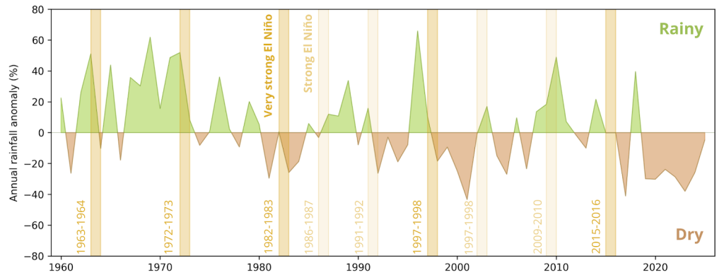 Ceci n'est cependant pas une sentence ! Au Maroc, les effets d’El Niño sur les précipitations ne s’expriment pas de manière mécanique : ils dépendent d’interactions complexes avec les circulations nord-atlantiques et méditerranéennes, qui peuvent en atténuer ou en réorienter les effets. El Niño est souvent associé à des déficits pluviométriques, en particulier au printemps, mais ce n'est pas toujours le cas. Entre 1960 et 2025, les épisodes El Niño forts n'ont pas forcément été suivis d'un déficit pluviométrique annuel.